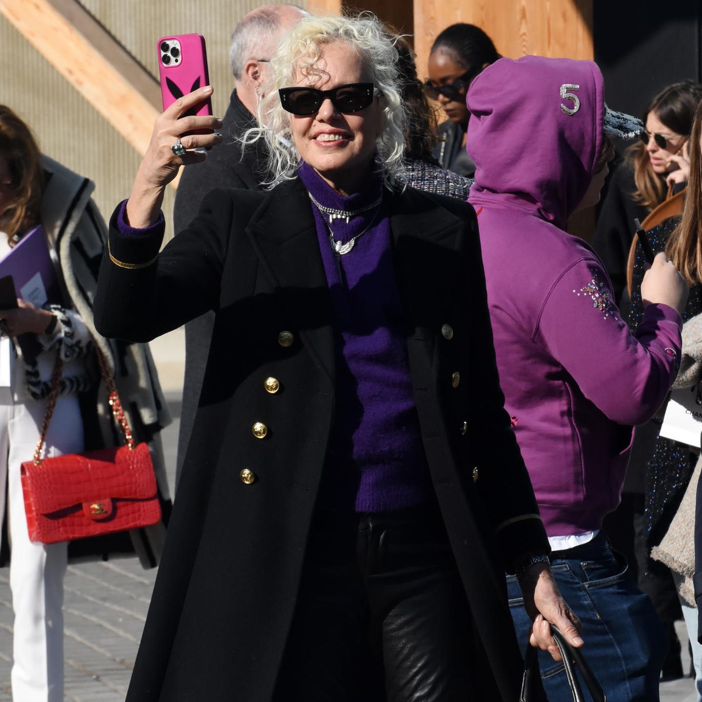 Von Kopf bis Fuß in ein Louis-Vuitton-Frühlings-Ensemble von 2022 gehüllt, begeistert die 26-Jährige mit einem lässigen weißen Crop-Top. Darüber stylt sie ein schwarzes, weit geschnittenes Lederkleid mit raffiniertem Cut-Out-Detail. Der kastenförmig geschnittene Samt-Blazer bricht den rockigen Schick auf und gibt ihm eine kühne und gleichzeitig elegant französische Note, während die glänzenden roten Satinboots mit Sophies Haaren um die Wette strahlen.