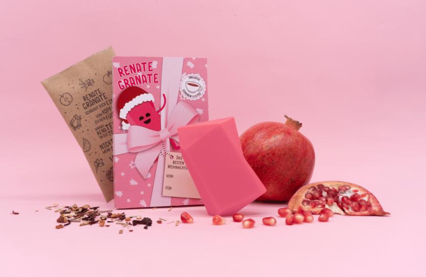 Zum Ende des Jahres überrascht Duschbrocken nochmal mit einer weihnachtlichen limited Edition. Im November hat Renate Granate ihr Comeback gefeiert, und zwar in einem neuen Gewand – ein knalliges Fuchsia ist dieses Jahr angesagt! Der Clou: Renate ist nicht allein gekommen! Um sich für die winterliche Jahreszeit aufzuwärmen, hat sie den „RenaTEE“ im Gepäck, dieser sorgt nach einer fetten Sause unter der Brause für eine leckere und gemütliche Abwechslung. Die Duschbrocken sind eine feste 2-in-1 Dusche für Haut und Haar. Renate Granate verführt den Geruchssinn mit ihrem angenehmen Granatapfel-Duft und verwandelt das Badezimmer in einen aromatischen Wohlfühlort. Ihr angenehmer Schaum und der erfrischende Duft machen den Duschspaß perfekt und lassen einen träumen: der Kamin knistert, Lebkuchen steht bereit und der leckere RenaTEE wartet nur darauf, probiert zu werden. Renate Granate und der RenaTEE sind im Onlineshop von Duschbrocken für ca. 9 Euro erhältlich.