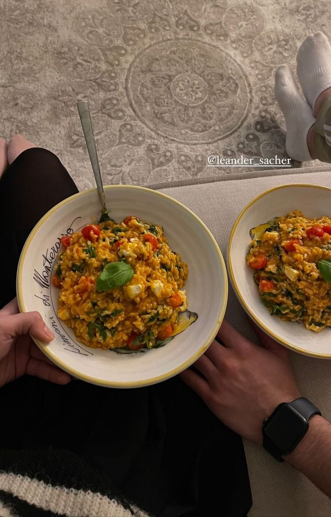 In ihrer Instagram-Story teilte Maxime jetzt ein Foto, auf dem sie einen Teller Risotto in der Hand hält. Neben ihr auf dem Sofa sitzt Leander, ebenfalls mit einem Teller der beliebten Reisspeise ausgestattet. Seine Hand ruht zwischen ihnen auf der Couch. Das Foto teilte auch der Beau in seiner Story. Einen einordnenden Kommentar zu dem Schnappschuss suchen die Follower der beiden allerdings vergeblich.