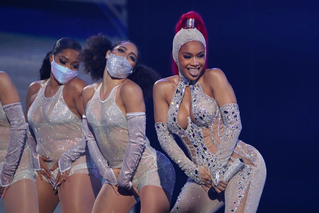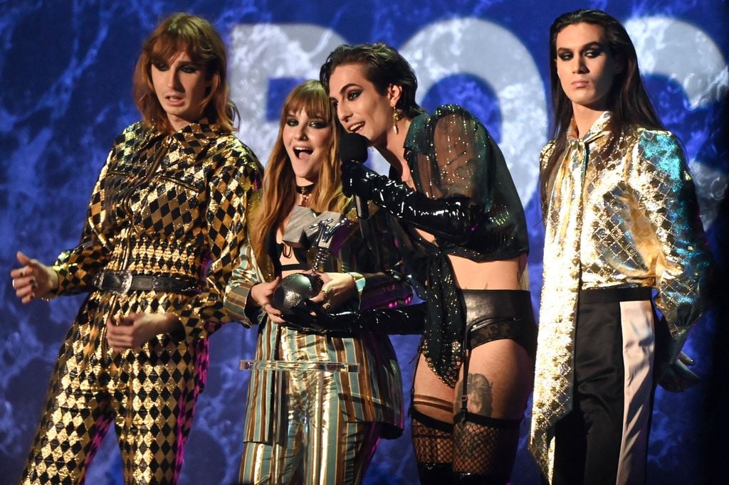 Die italienische Rockband M\u0026#229;neskin räumte nicht nur in der Kategorie bester Rocksong ab, sondern machte auch auf dem roten Teppich von sich Reden: Frontmann Damiano David (22) posierte in einem knappen, paillettenbesetzten Lederhöschen, bauchfrei und mit Strapsen neben seinen Bandmitgliedern, die sich ebenfalls ordentlich herausgeputzt hatten. Auf dem offiziellen Instagram-Profil der Band schrieben Thomas Raggi (20), Ethan Torchio (21) und Victoria De Angelis (21): „Der Award für das beste Outfit geht an Damiano.“ Neben ihnen sorgte vor allem Sängerin Saweetie für Wow-Momente der besonderen Art: Die Sängerin wechselte ihren Look mehrmals. Auf der Bühne performte sie im sexy Glitzerfummel mit riesigem Ausschnitt, auf dem Red Carpet präsentierte sie den Fotografen ein heißes Transparent-Outfit in Schwarz.