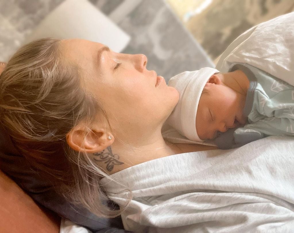 In ihrer Instagram-Story veröffentlichte die frisch gebackene Mama jetzt ein Foto aus ihrer Wochenbettzeit. Sharna posiert hier mit ihrem Baby auf dem Arm im Spiegel. Sie trägt nur einen Bademantel, Still-BH, ein Höschen sowie eine Art Stütze für ihren Bauch – der wie bei den meisten Müttern noch rund von der Schwangerschaft ist. „Mein Körper war nach der Geburt nicht mehr wiederzuerkennen“, schrieb die Beauty dazu. „Jedes Gramm Wasser in meinem Körper ist in die Vagina und nach unten gewandert“, witzelte sie weiter.