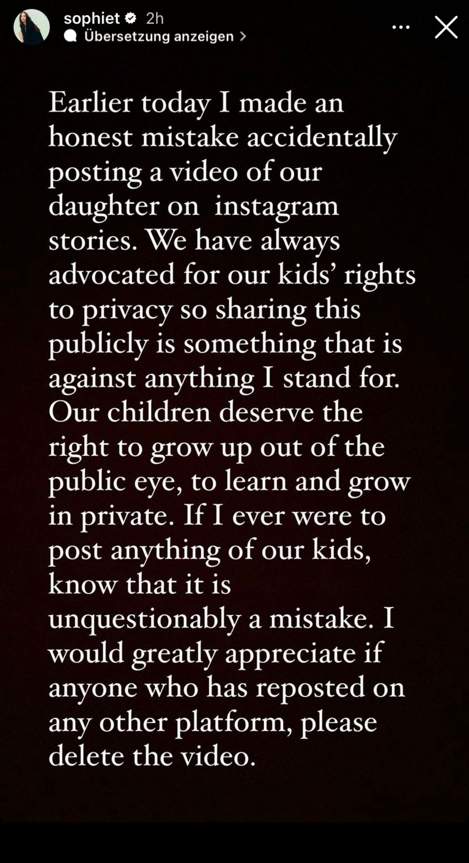 "Vorhin habe ich einen wirklich schlimmen Fehler gemacht, indem ich ein Video von meiner Tochter in meiner Instagram-Story gepostet habe. Wir haben uns immer für die Privatsphäre unserer Kinder eingesetzt – dies nun öffentlich zu machen ist gegen alles, wofür ich stehe", schrieb die zweifache Mutter wenig später auf der Plattform. "Unsere Kinder verdienen das Recht, außerhalb des öffentlichen Auges aufzuwachsen, zu lernen und privat groß zu werden", verdeutlichte sie ihre elterlichen Prinzipien – und erklärte mit einem Augenzwinkern nach dem Schreck: "Falls ich also jemals wieder was von meinen Kindern poste, wisst ihr, dass das nur aus Versehen ist."